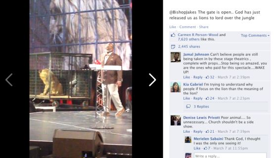 Bishop TD Jakes is under fire for using unnecessary caged lion to preach his sermon. The title of Bishop Jakes sermon: The gate is open.. God has just released us as lions to Lord over the jungle. Check out the video. What are your thoughts? Did Bishop Jakes really need a caged lion during his sermon, visuals?
